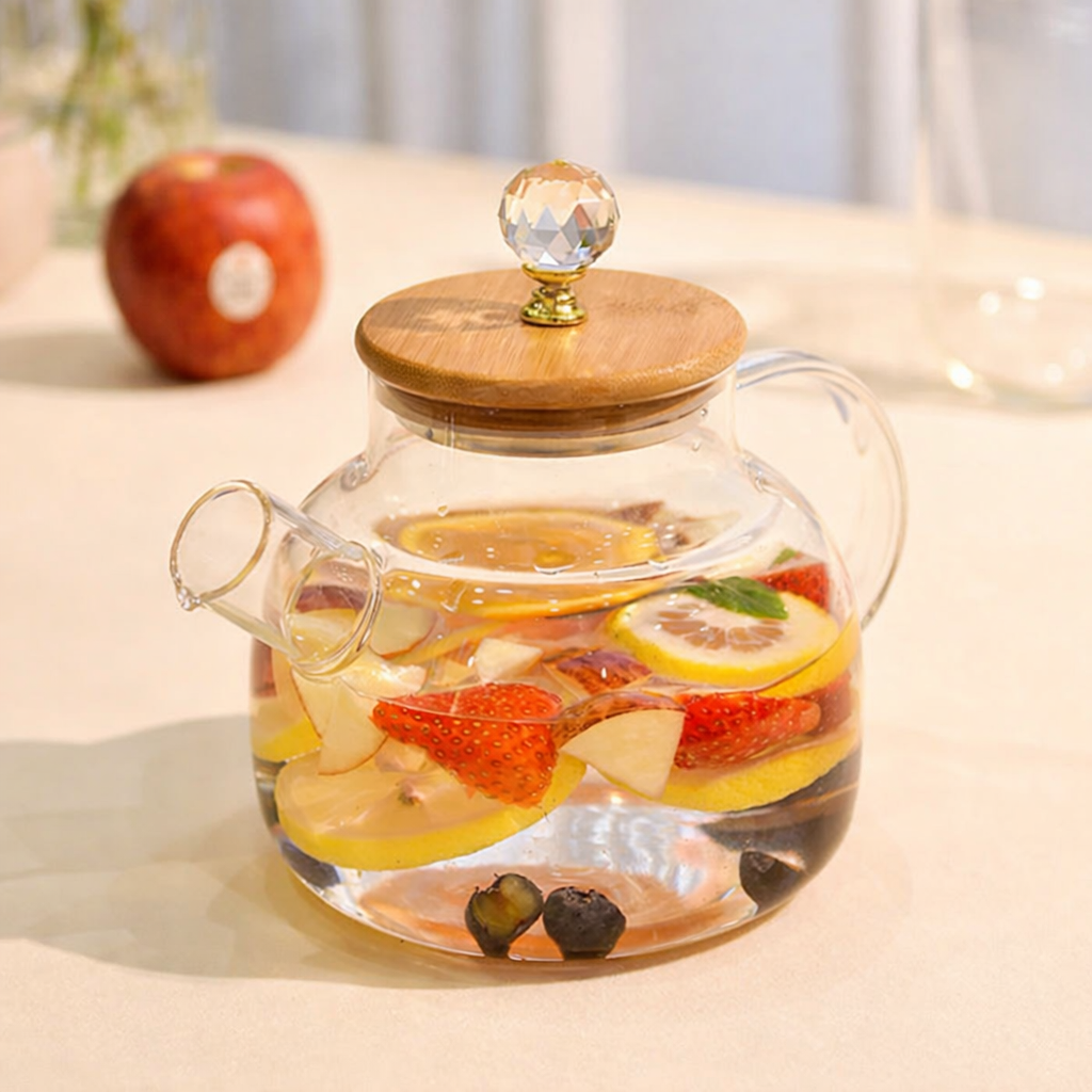 Classic Transparent Glassware Set – Luxury Smooth Glass Teapot with 6 Cups & Wooden Cup Holder
